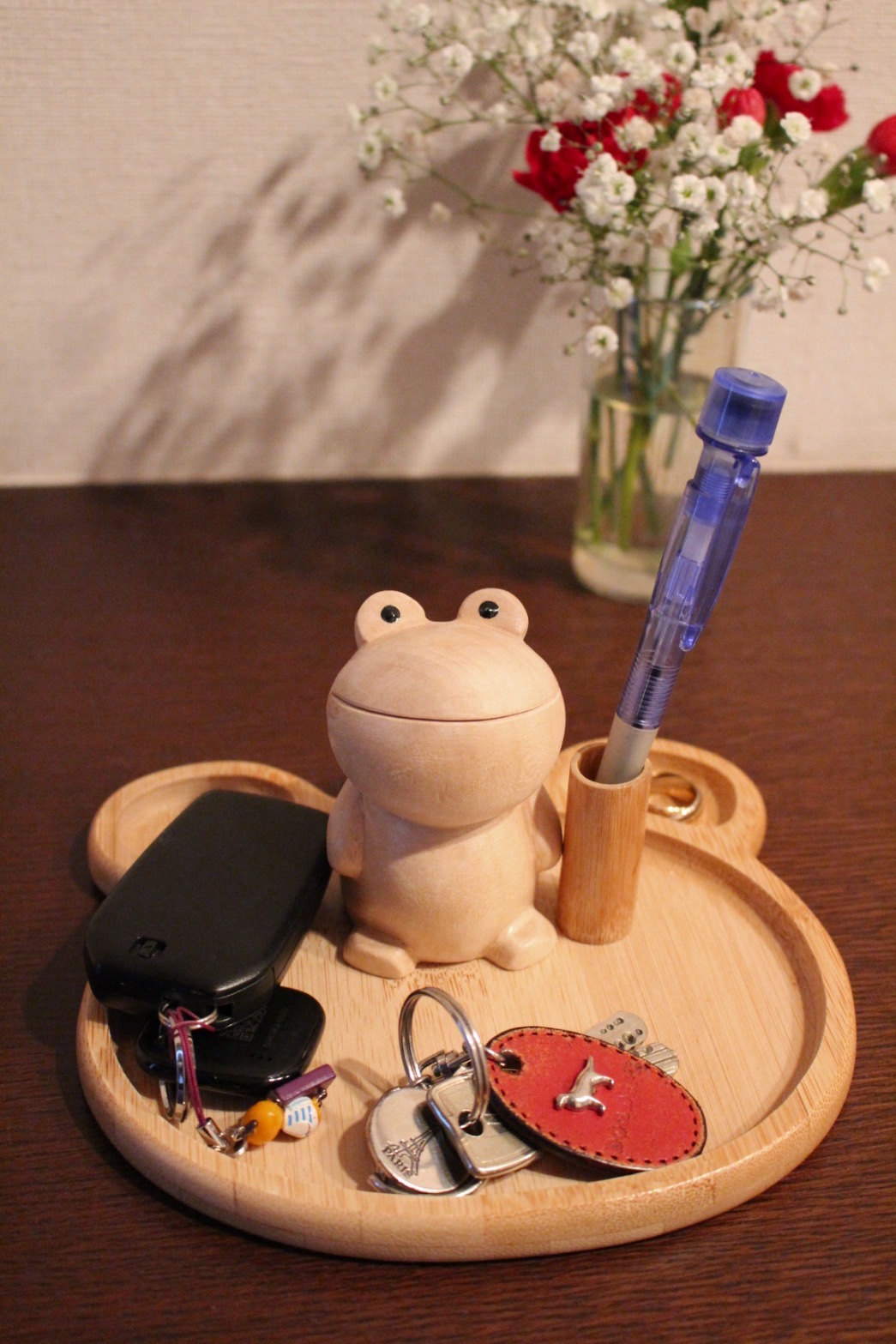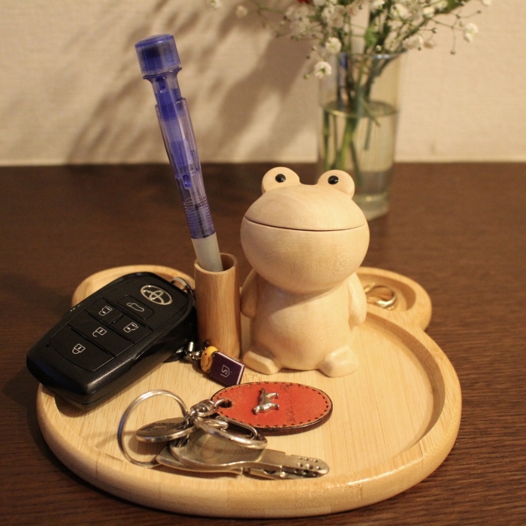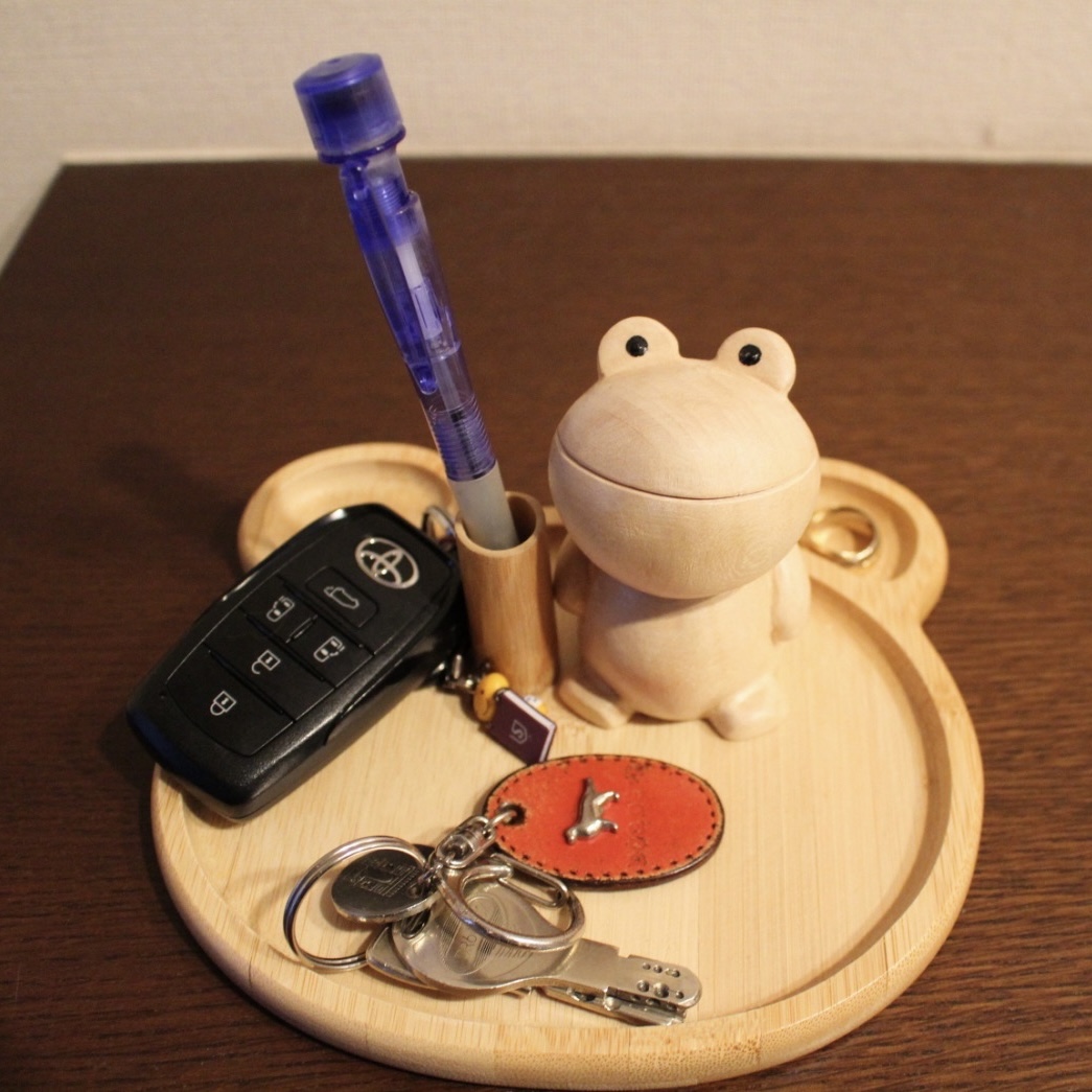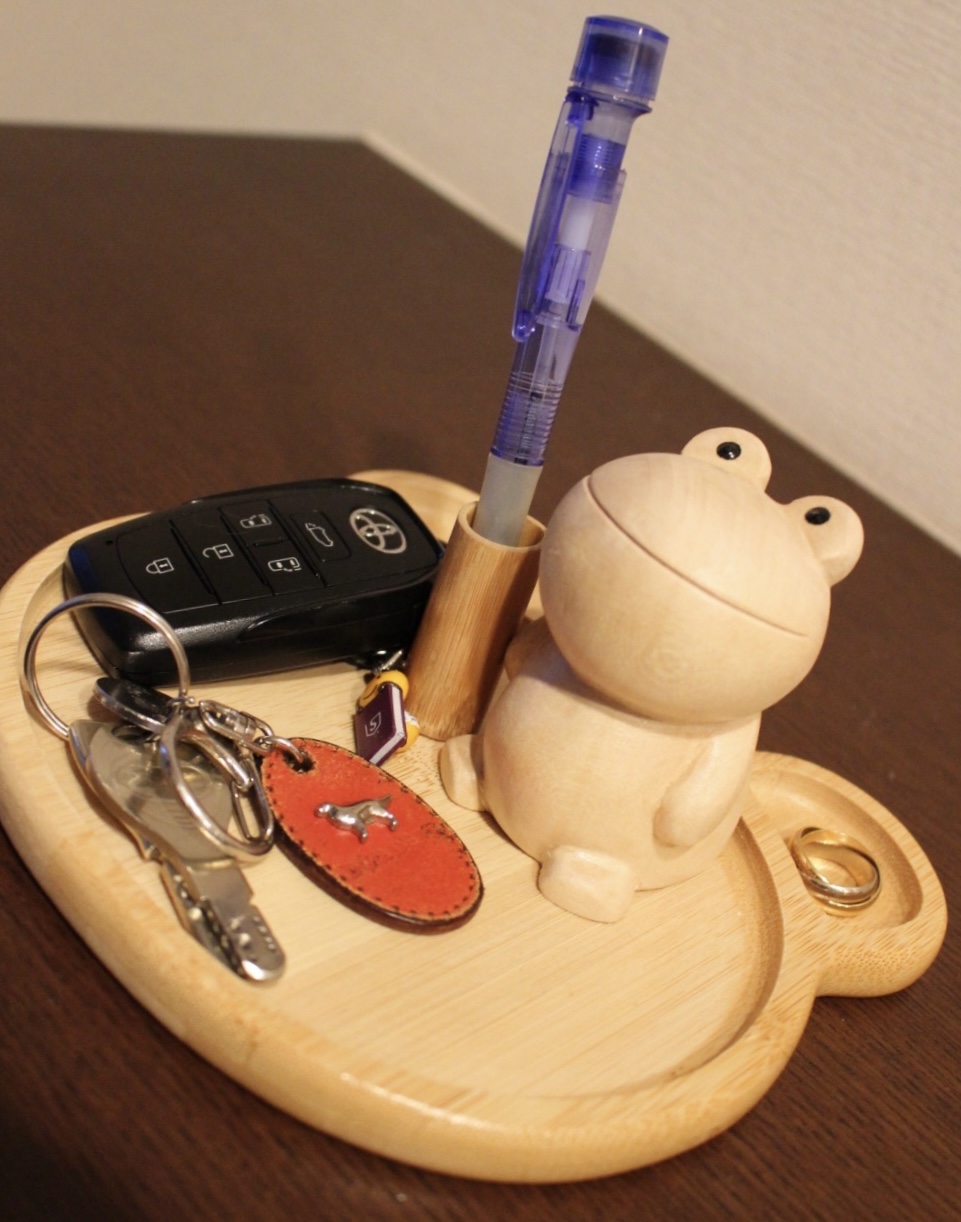 友人より「カエルのスマホスタンドを玄関のキー&ペンスタンドにアレンジしてほしい」とのオーダーを受けて制作しました。