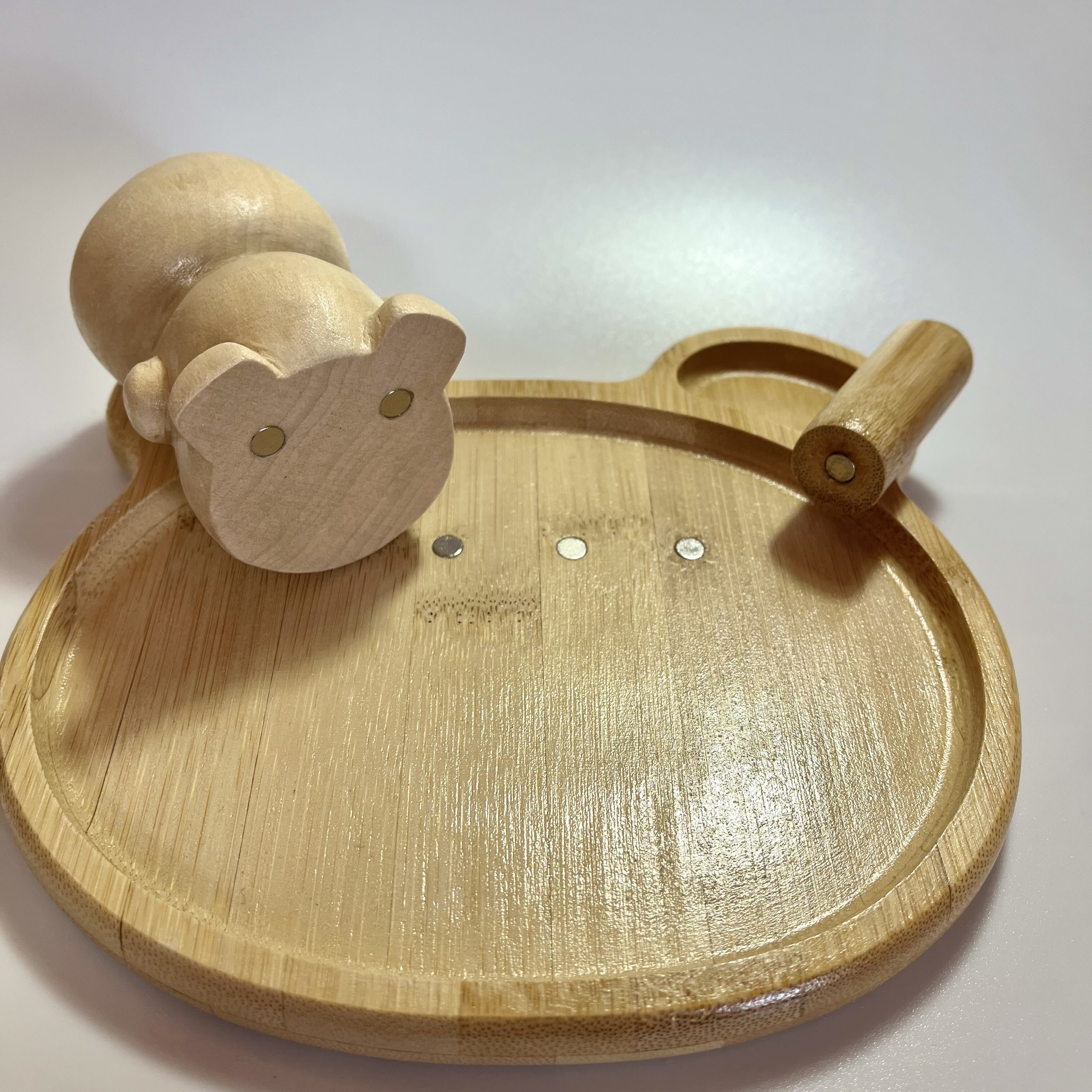かわいげのある「鮭をくわえたクマ」を彫ってほしい、というオーダーにお応えしました。クマの口と鮭に磁石を入れたので、パチっとくわえます。