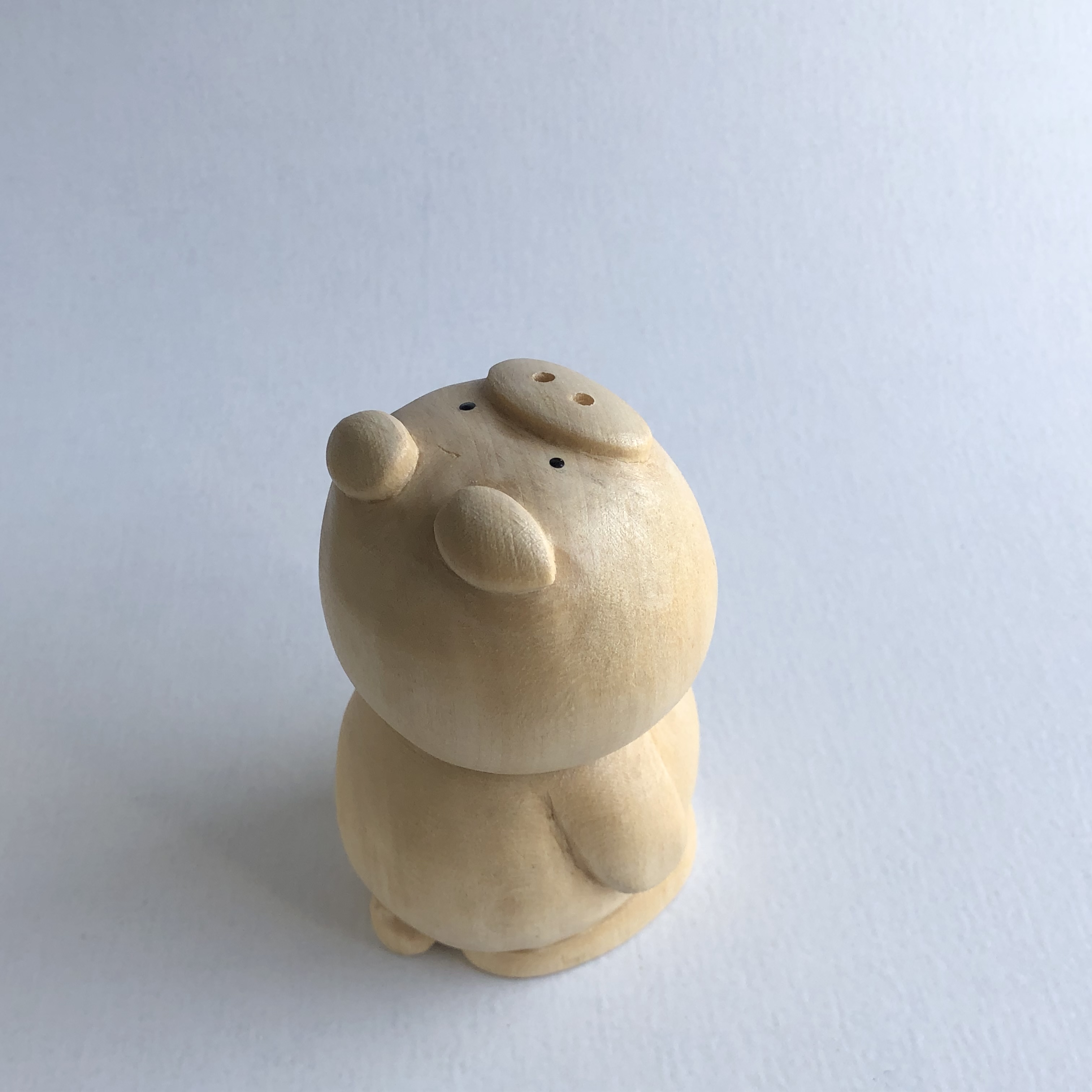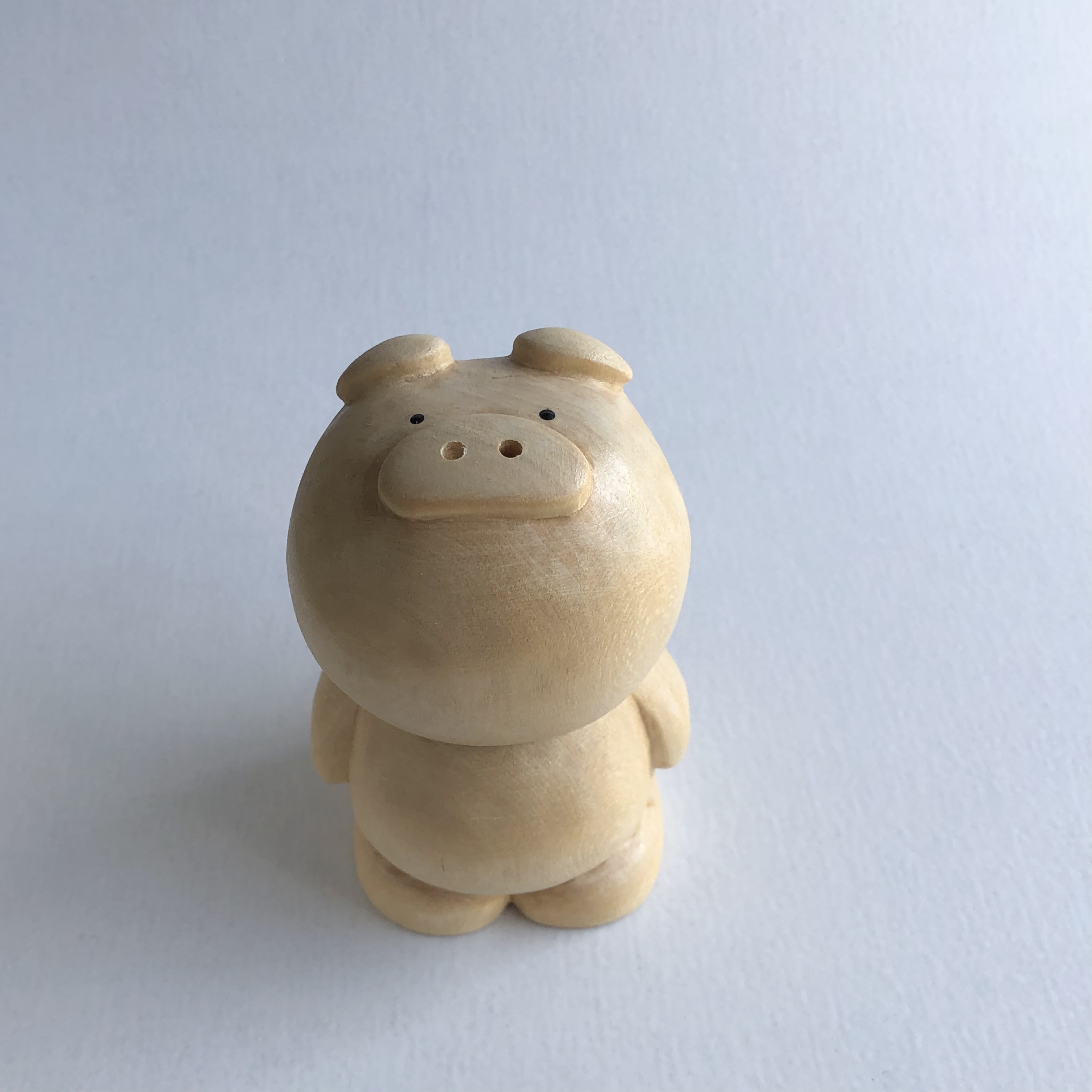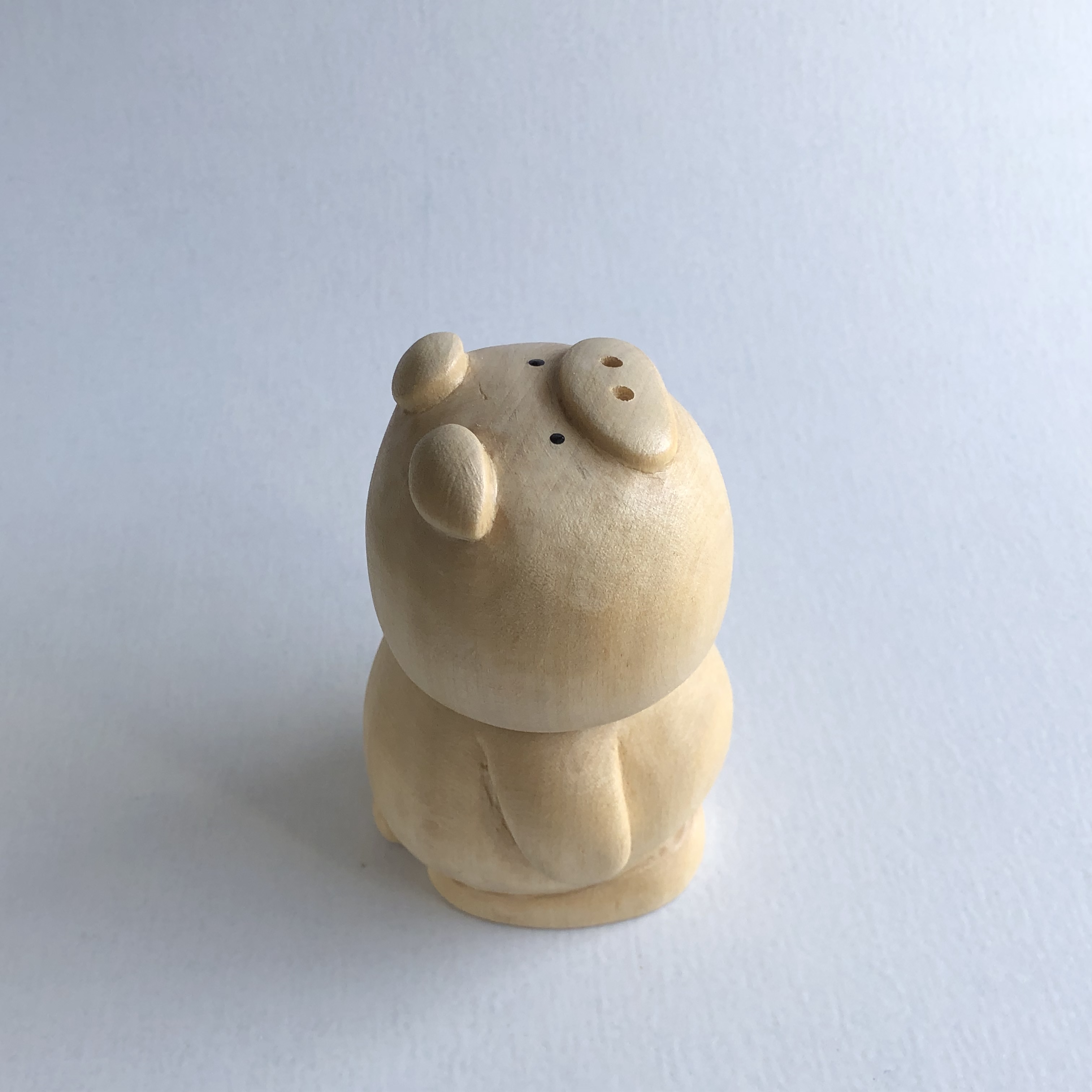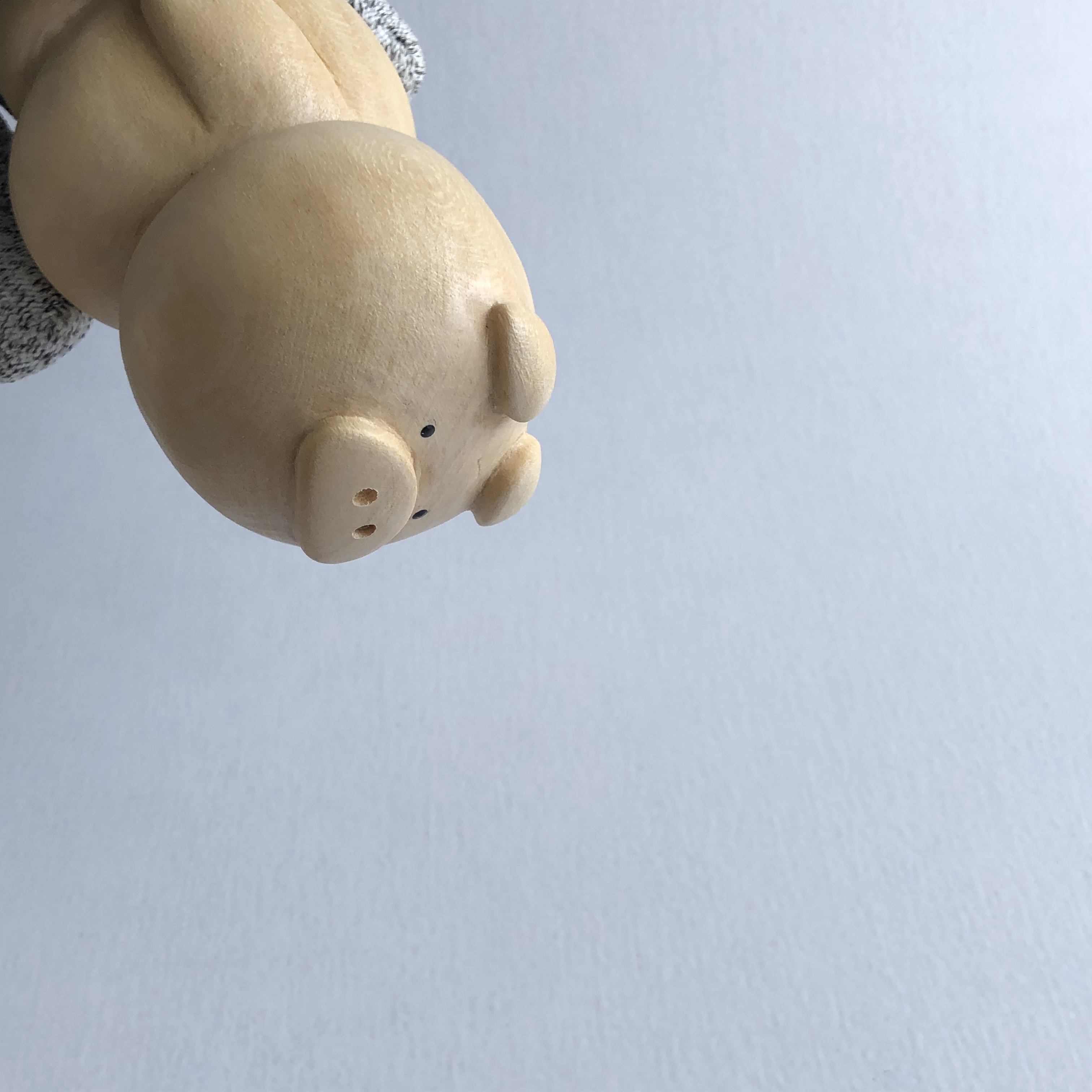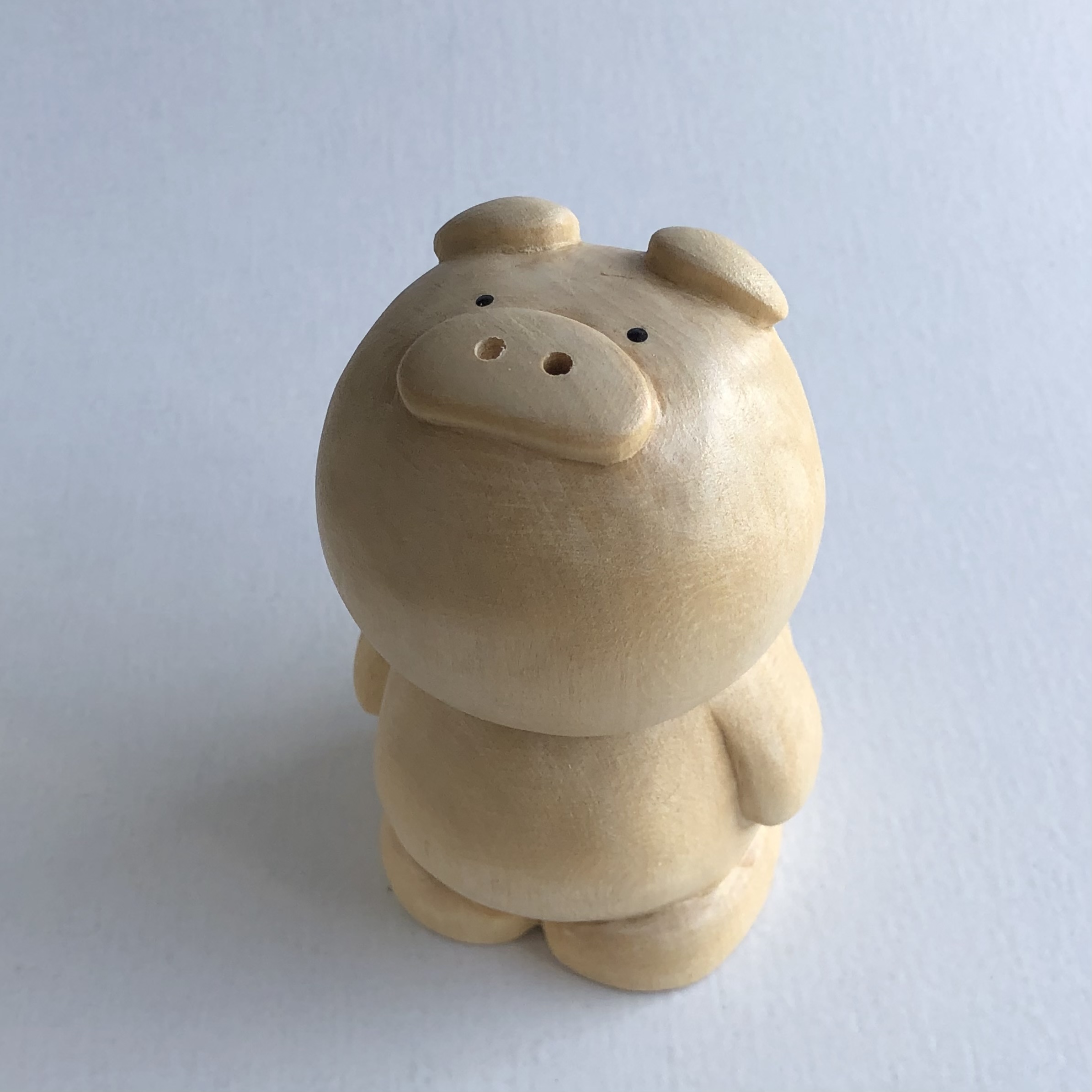 丸みのあるフォルムで空を見上げる木彫りのブタです。