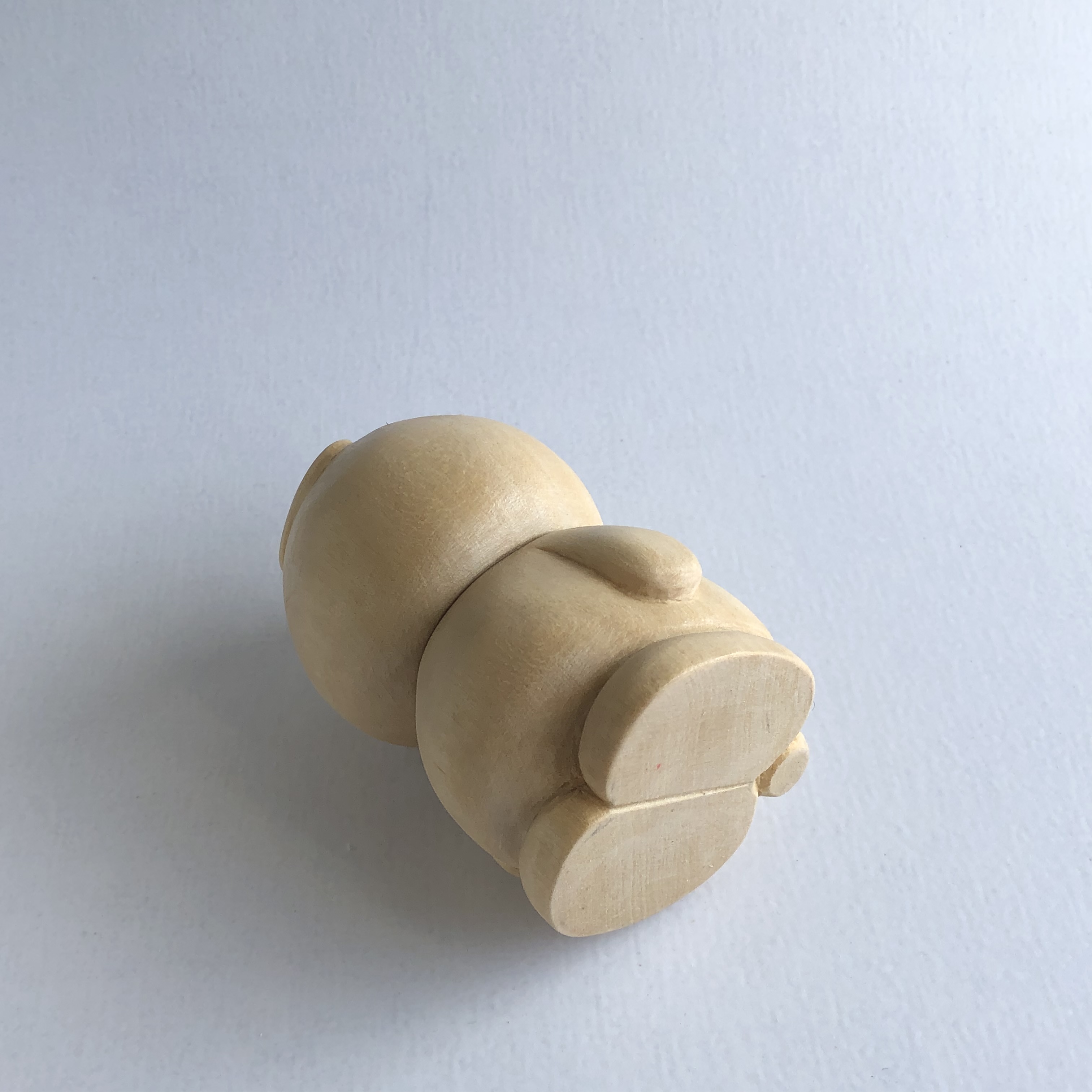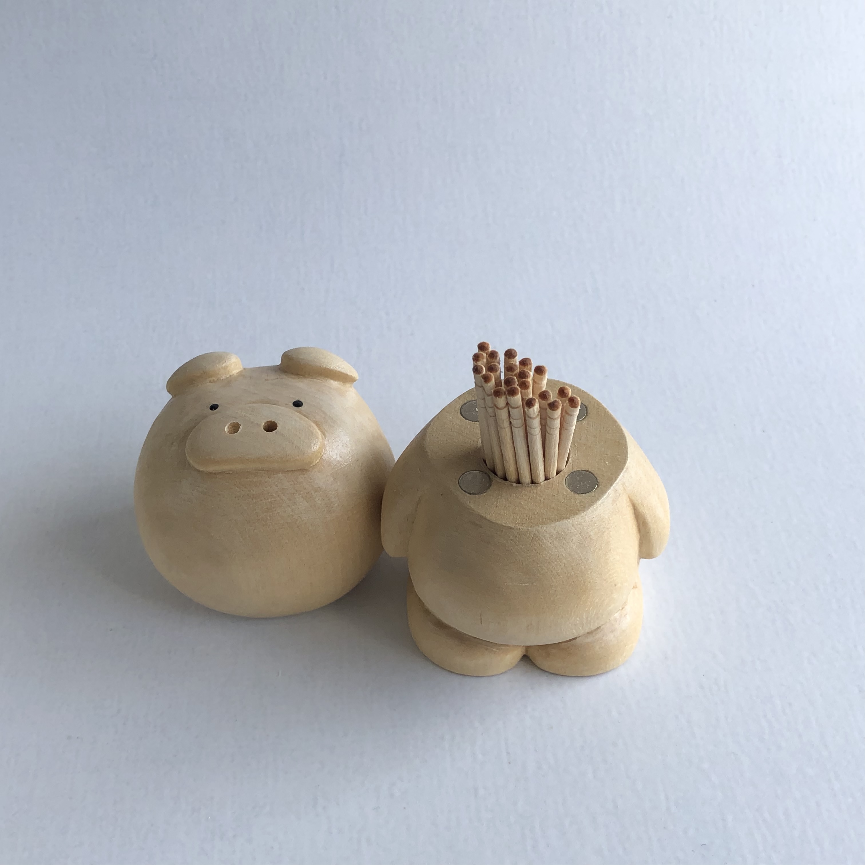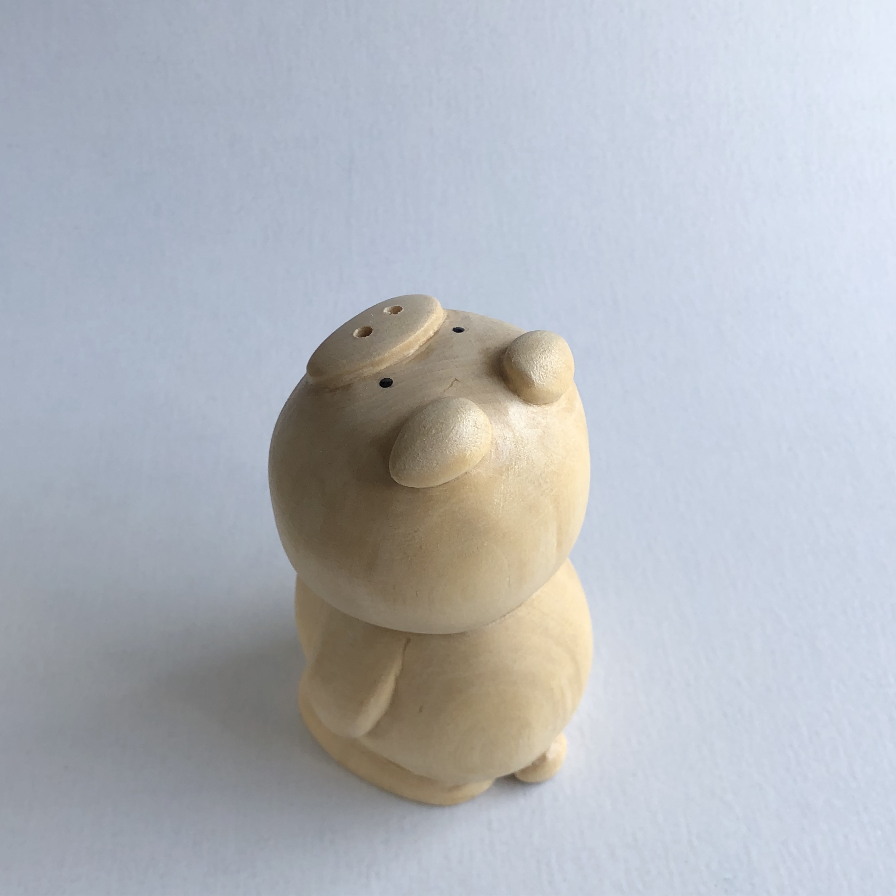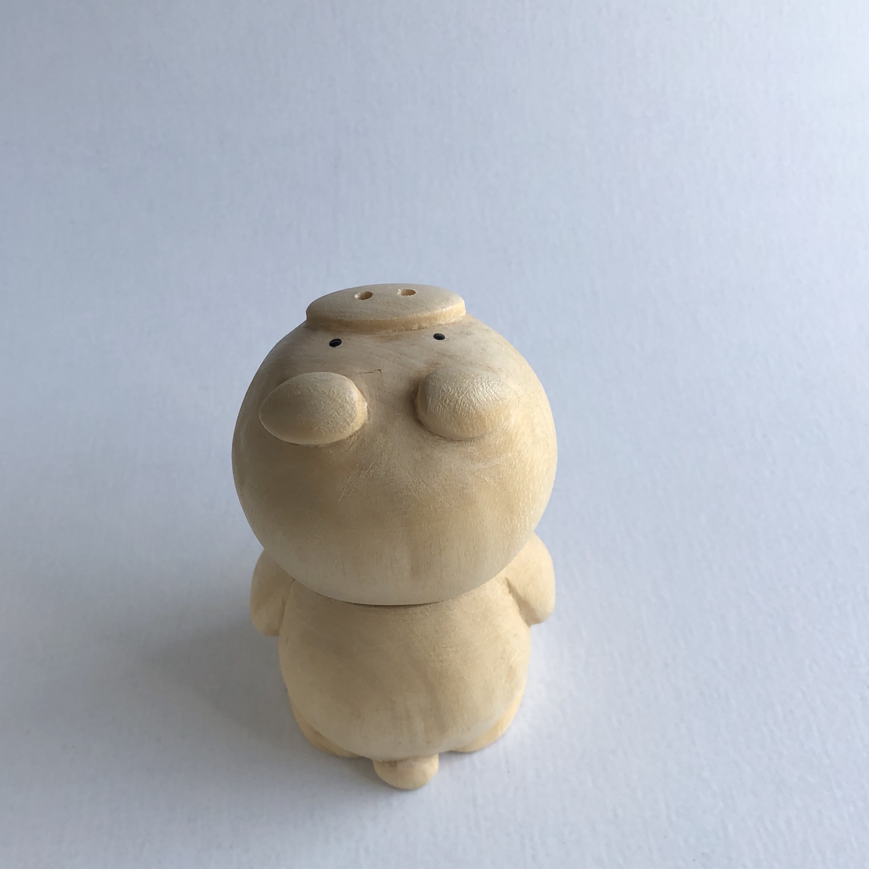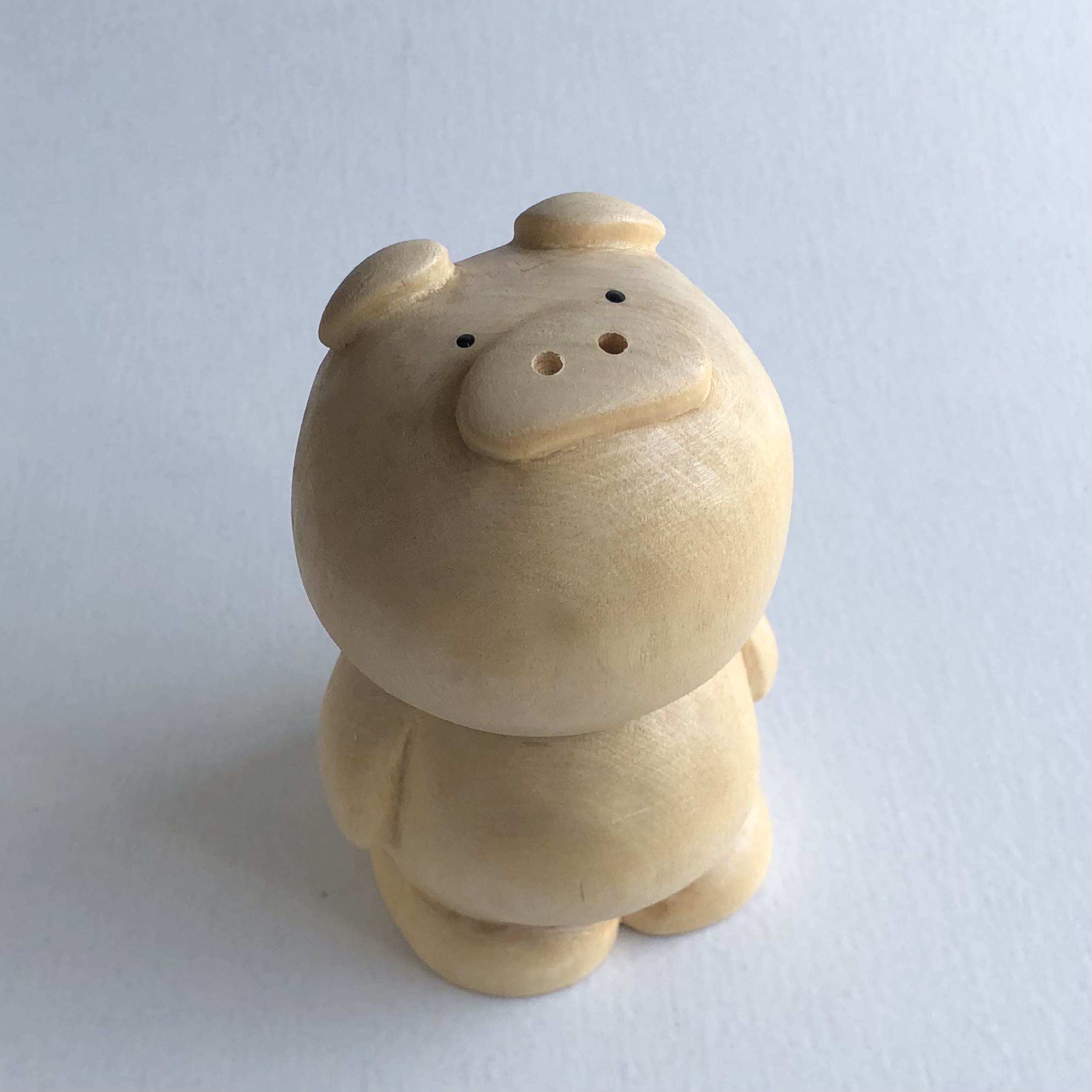 丸みのあるフォルムで空を見上げる木彫りのブタです。