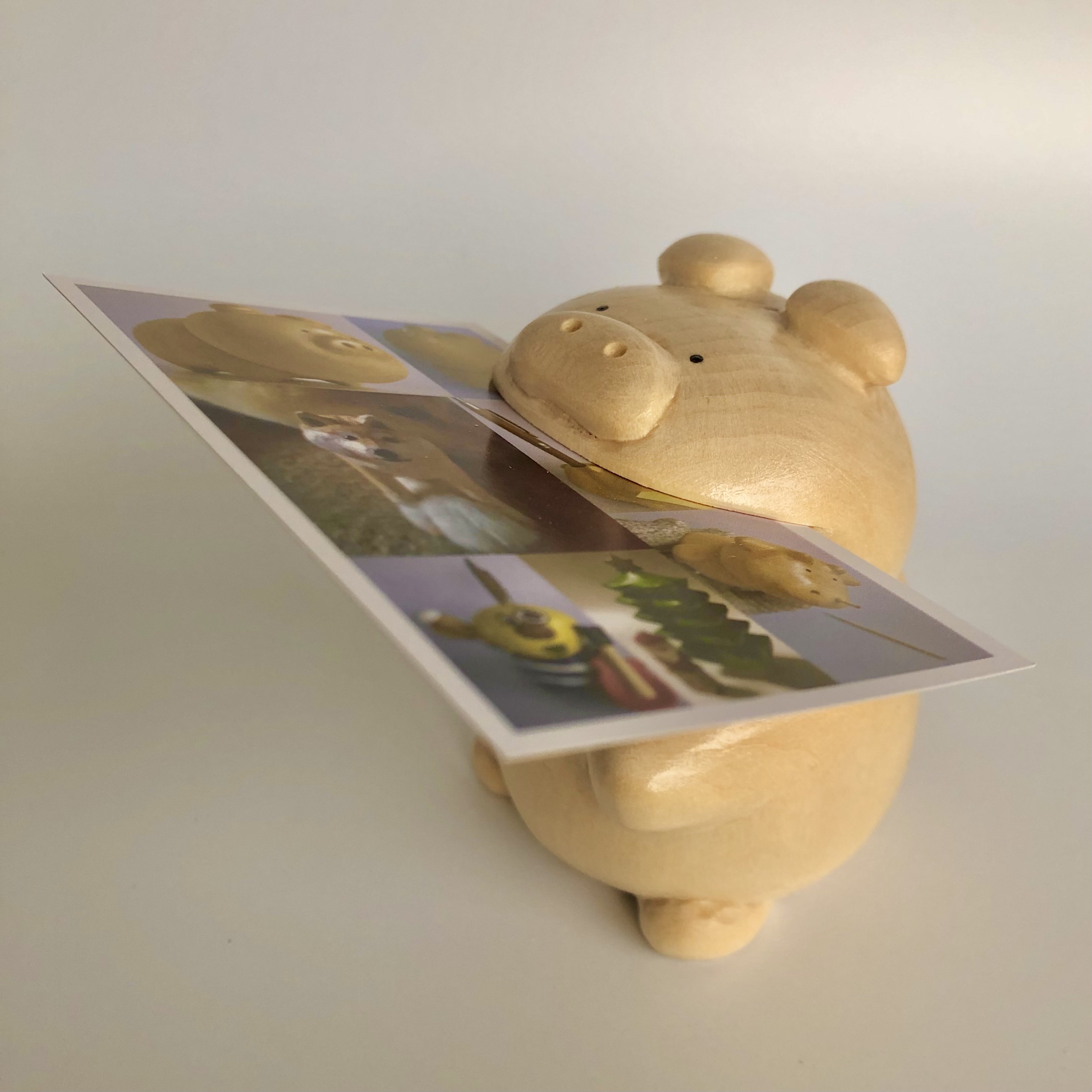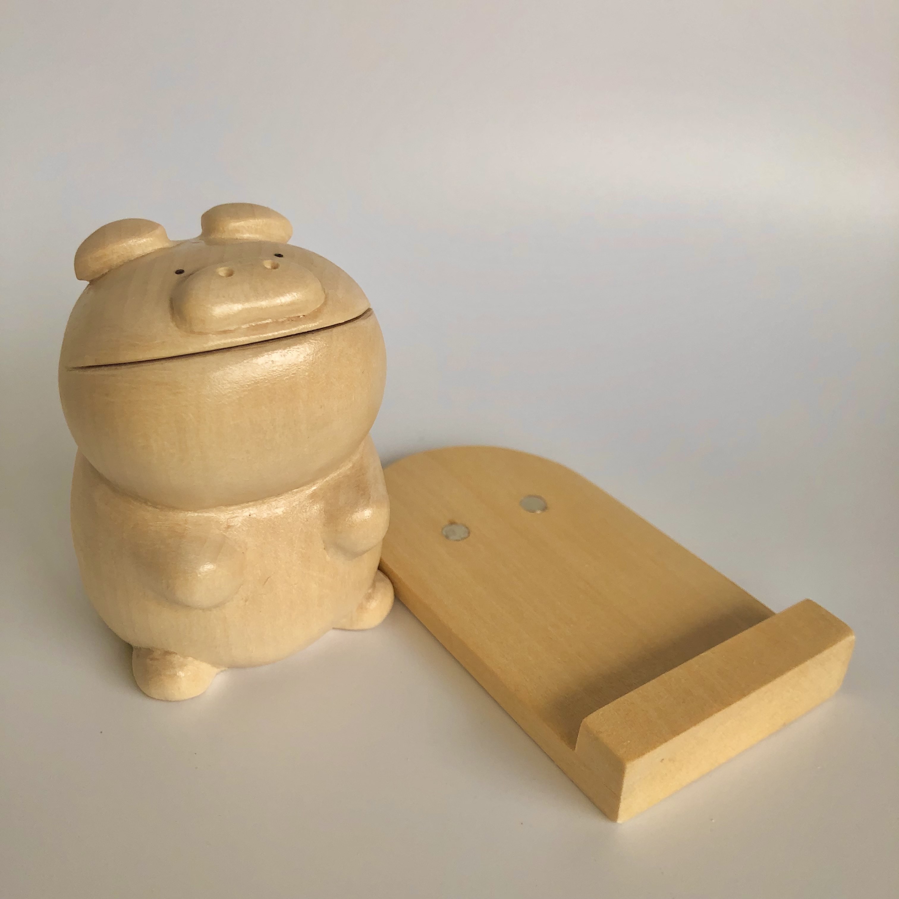 はたらき者の木彫りブタ(スマホスタンド&メモホルダー) 丸っこくあいきょうのある木彫りのブタの置物。付属の台と磁石同士で合体させるとスマホスタンドや名刺置きなり、口にはメモや名刺もくわえられる「使える置物」です。ブタの向きを前後に変えることでスマホの角度を2段階に調整できます。ご家庭やオフィス・店舗などで、またプレゼントとしてもぜひ!日用で汚れにくくするため、水性ニスを二度塗りしてあります。 素材天然木(シナ)、水性ニス高さ:約7.5cm、長さ:約5.5cm、スタンドの長さ:約10cm minne 共有: クリックして X で共有 (新しいウィンドウで開きます) X Facebook で共有するにはクリックしてください (新しいウィンドウで開きます) Facebook いいね 読み込み中… 関連